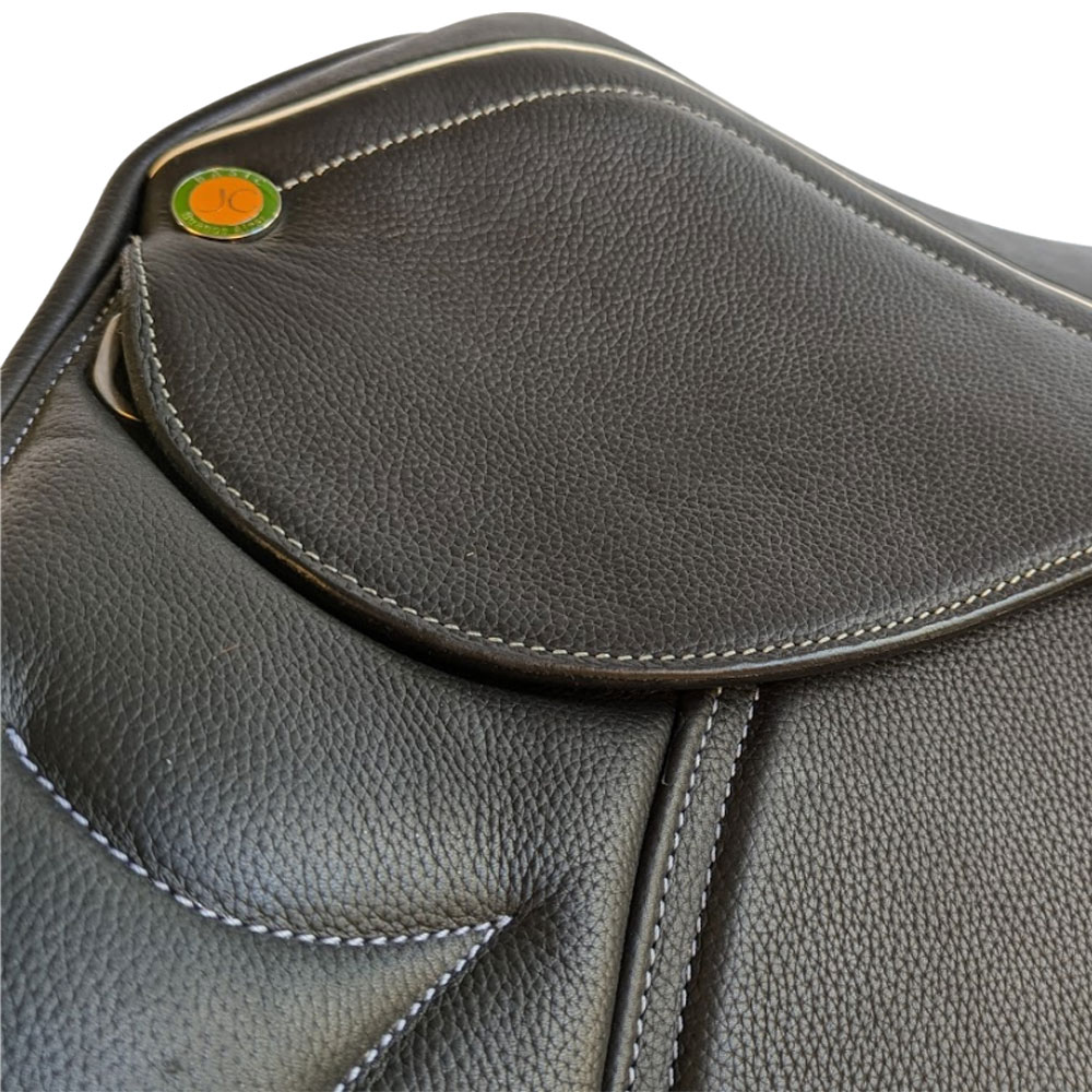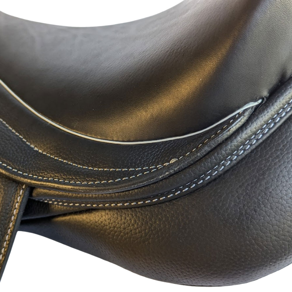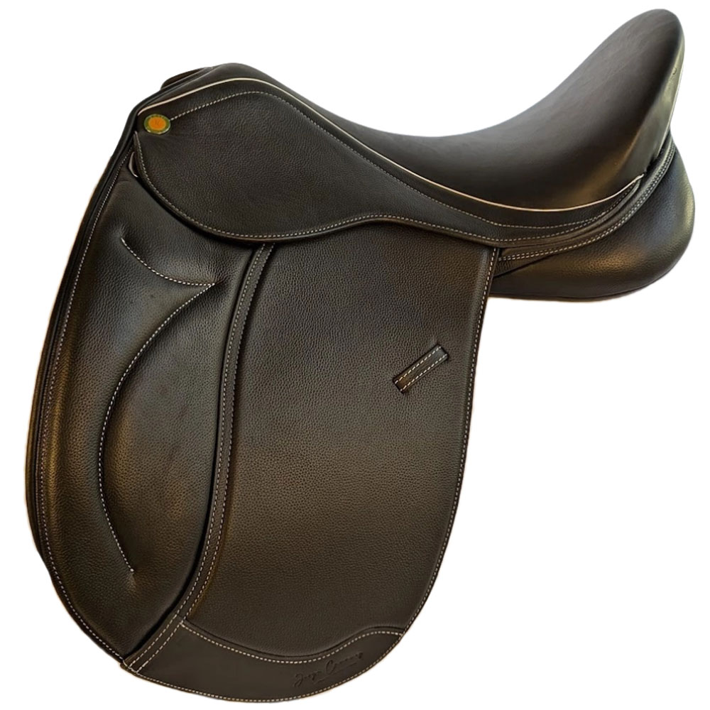 Der Vries Dressur von Jorge Canaves Saddlery ist ein Allrounder für kräftige Pferde. Der Sattel hat weiche, wollegefüllte Kissen und einen breiten Kissenkanal. Die Kissen sind vorne tiefer angesetzt und bieten mehr Schulterfreiheit. Die Klettpauschen lassen sich individuell an den Reiter anpassen. Der verbaute Kunststoff-Rahmenbaum ist mit Stahlfedern verstärkt und bietet die nötige Stabilität und Flexibilität. Das eingebaute Kopfeisen ist durch ein Sattelverstellgerät einstellbar. Es ist ein A-förmiges oder U-förmiges Kopfeisen lieferbar. Der Sattel kann ab Werk mit verschiedenen Kissenformen ausgestattet werden. Der Vries Dressur bietet weiche, doublierte Sattelblätter. Er ist aus robustem, offenporigen Rindsleder gefertigt.
