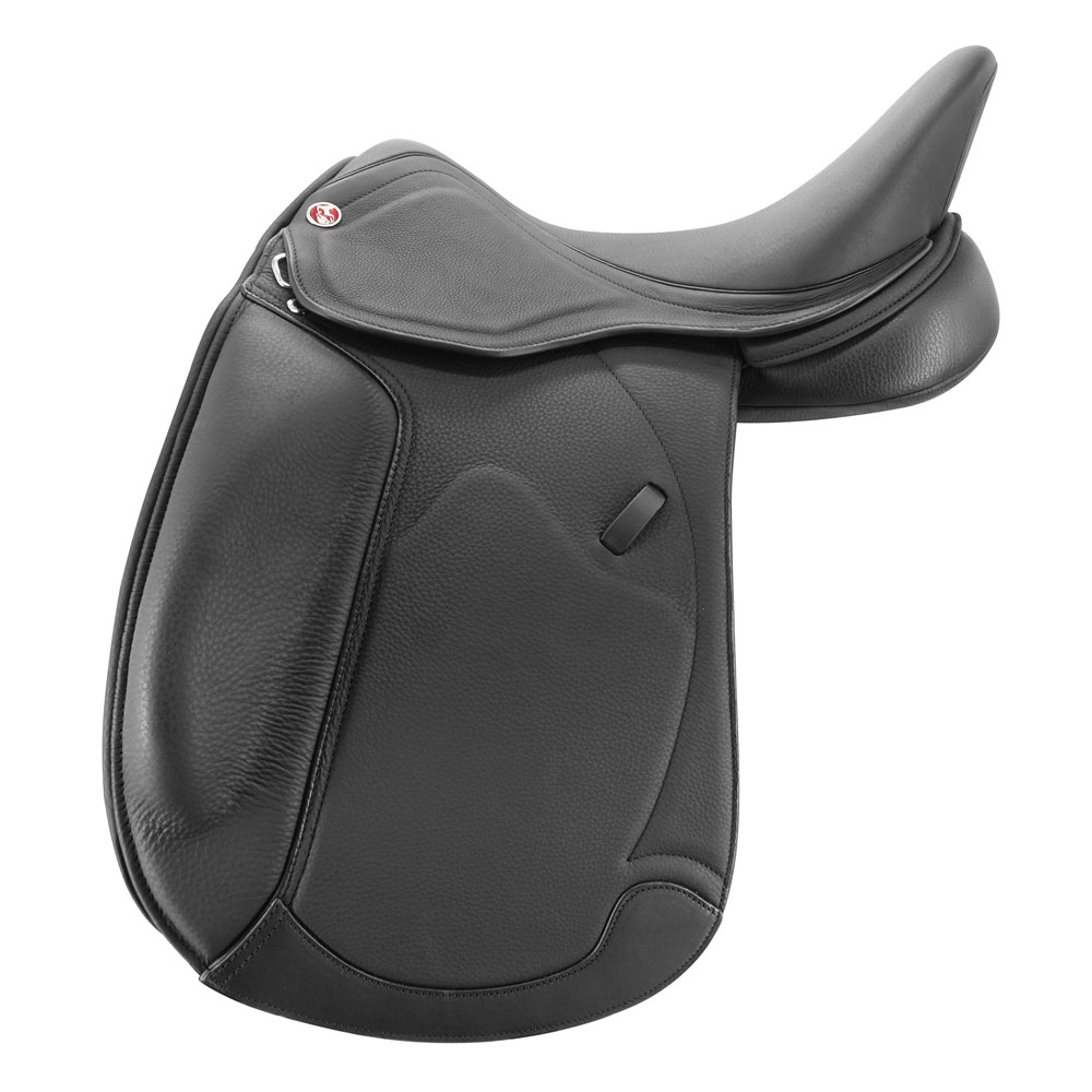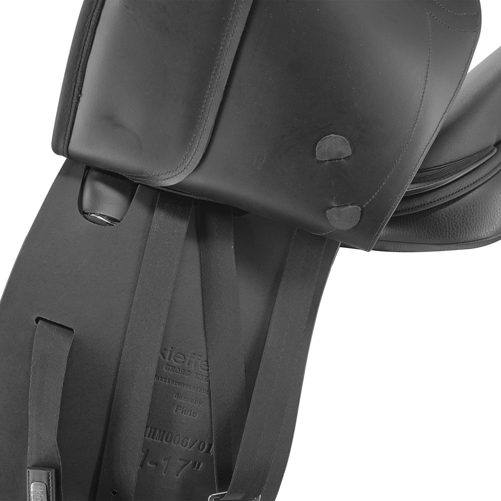 Dressursattel Pluto wurde speziell für kompakte, breite Pferderassen mit wenig Widerrist und kurzer bis normaler Rückenlänge entwickelt. Sein weich gepolstertes Sattelkissen mit Rückschnitt und halber Kissenlänge im Schulterbereich sorgt für optimalen Komfort und Bewegungsfreiheit. Der stufenlos verstellbare Sattelbaum ermöglicht jederzeit eine individuelle Anpassung. Dank der optimierten Strippenführung wird auch das Problem einer zu weit vorne liegenden Gurtlage effektiv ausgeglichen. Der Reiter nimmt Platz in einem tiefen, angenehm weichen Dressursitz. Doublierte Sattelblätter mit aufgesetzter Pausche geben bei rundlichen Pferden bequemen Halt und ermöglichen guten Beinkontakt. All diese Eigenschaften machen Pluto für Reiter von Haflingern, Norikern, Andalusiern, Lipizzanern, Tinkern und weiteren kompakten Rassen interessant.