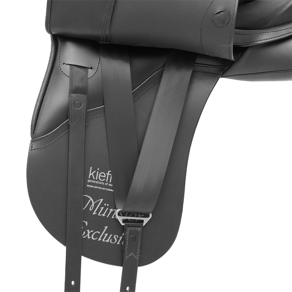 Der Dressursattel Münster mit flexibel verstellbarem Sattelbaum und im vorderen Bereich verkürzten Halbkissen, sorgt für extra Komfort und Schulterbewegungsfreiheit. Im hinteren Bereich sorgt der Zuschnitt des Classic-Kissens für eine flachere Auflagefläche mit optimierter Druckverteilung und schafft gleichzeitig ein neues Sitzgefühl mit mehr Nähe zum Pferd.